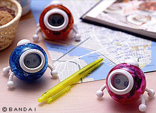 LCD, LED (heart-shaped light), robot arms, speaker, energy tank for robot arm (AAA battery), energy tank for electrical brain (Button-cell Lithium battery CR2032), and a sensor. (The sensor reacts when it receives any vibration/bouncing action.)Back side: 3 buttons total, A button (select, sound-off button), reset button (in the middle), and B button (choose, clock set) Front
