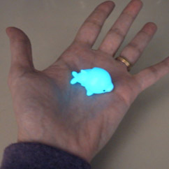 | Here he is glowing in his box before I even opened it, and then again in my hand. Notice how bright he glows and the room isn't even that dark! |