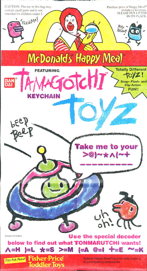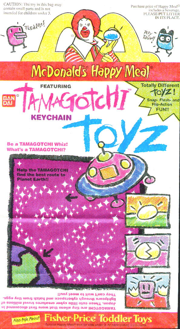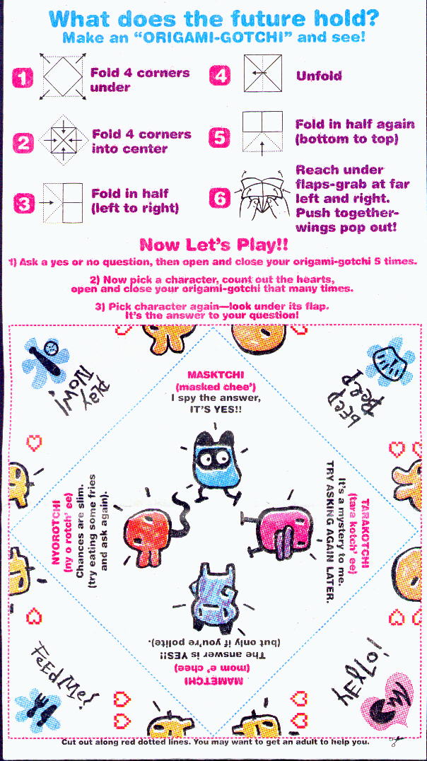 There are 2 versions of the Tamagotchi Happy Meal Bags. I have scanned them both for my international friends who are not able to buy them. You can also make the Origamigotchi without cutting up your bags if you click here and print it out.