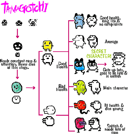 "If you keep your Tamagotchi full and happy, it will grow into a cute, happy cyber creature. If you neglect Tamagotchi, it will grow into an unattractive alien" - Bandai instruction booklet