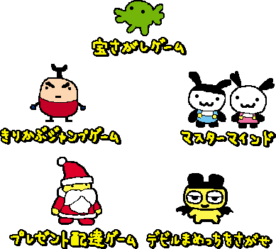 たまごっちのいろんなゲームであそんでみよう! クリアすると、おトクなかくれキャラ情報がみれるヨ。 |