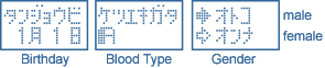 "Month" will be blinking. Use the A button to select your birth month, and the B button to enter. In the same manner enter your birth day, blood type and gender.