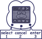 Press the 3 button to check on the progress of your egg. Press the 1 button to find out the meter fullness of your character. If you don't take good care of your character, the meter can decrease so be careful. The third stage is the most important to pay attention to! It is possible that no matter how hard you try, the meter will not increase that day.